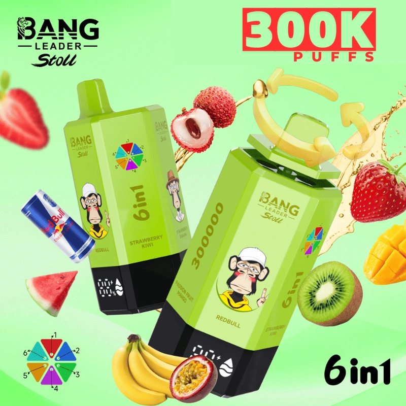 Bang Leader Stoll 300000 (Bang Leader Stoll 300k) is a 6-in-1 disposable vape that lets you rotate between six pre-filled flavor chambers using a physical dial, with an OLED display showing battery and e-liquid levels. A 650mAh rechargeable battery with USB-C keeps downtime low, while mesh coils are designed to maintain consistent flavor and vapor from start to finish.